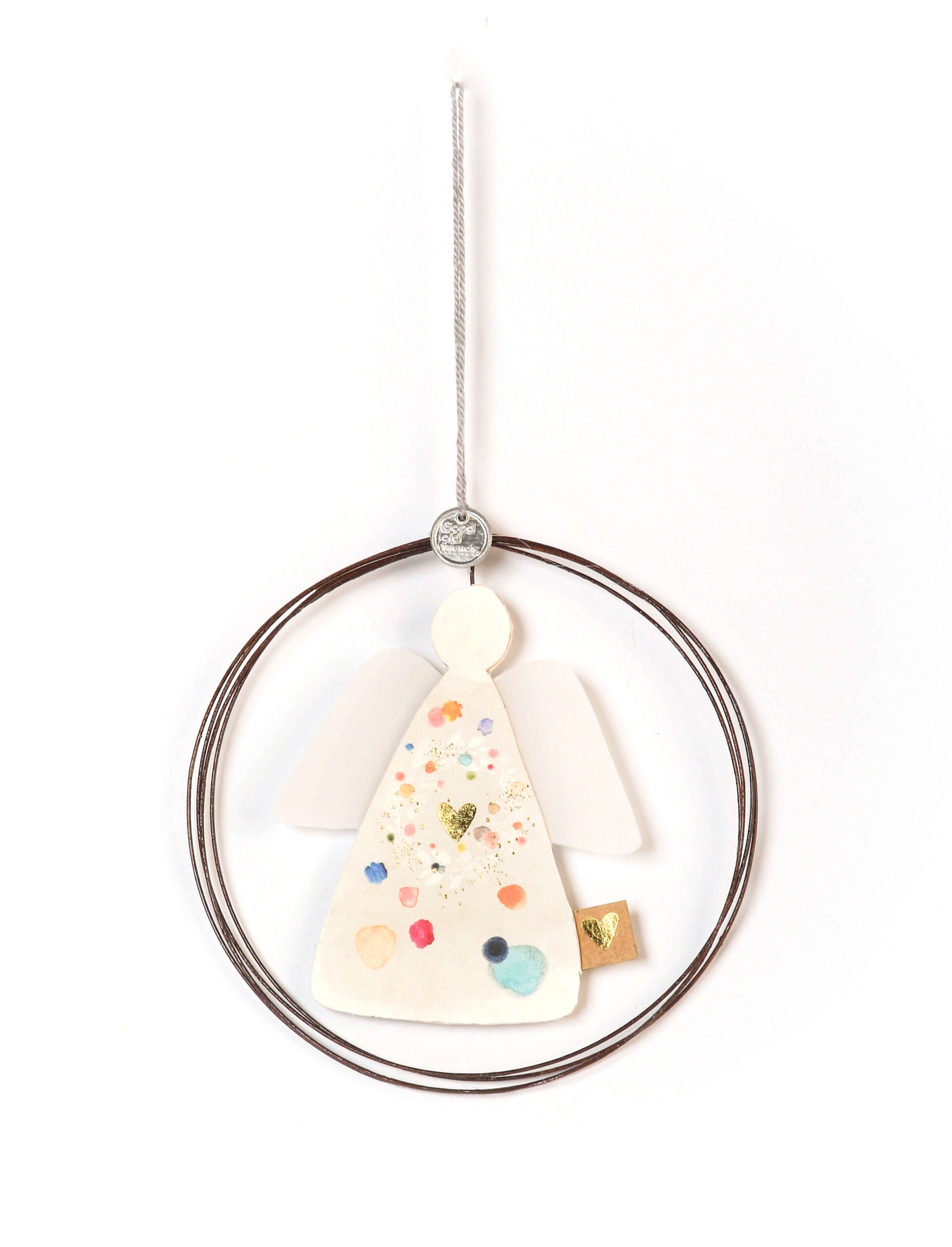 Liebevoll gefertigter Engel zum aufhängen aus Draht, Papier und mit goldenen Details.